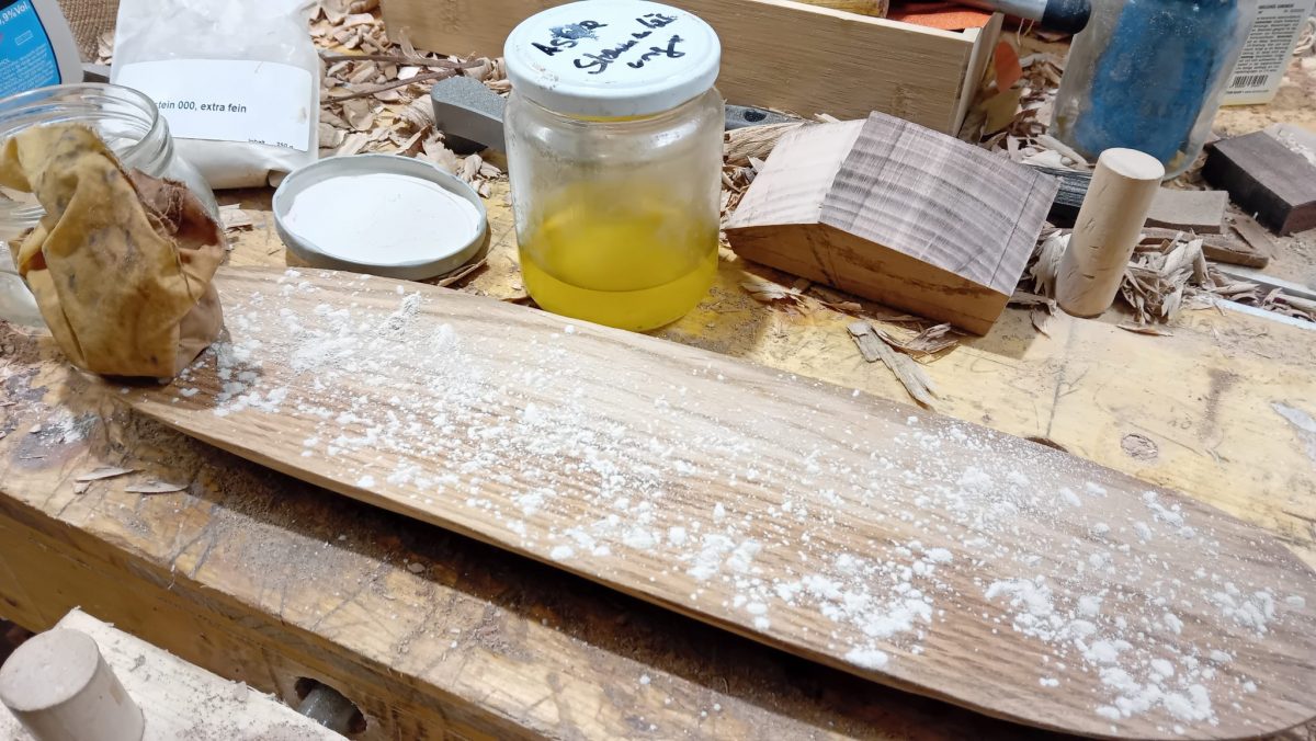 Als Basis dient eine schlichte, elegante Schale aus Eichenholz. Um die Oberfläche richtig glatt zu bekommen, werden die Poren mit Bimsmehl und Schellack gefüllt. Danach noch 3 Anstriche mit Schellack.