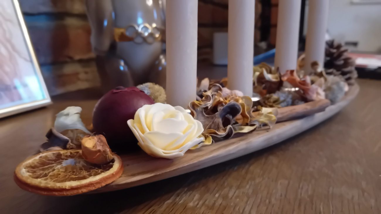 Ein Potpourri auf einer Eichenholzschale als Adventkranz